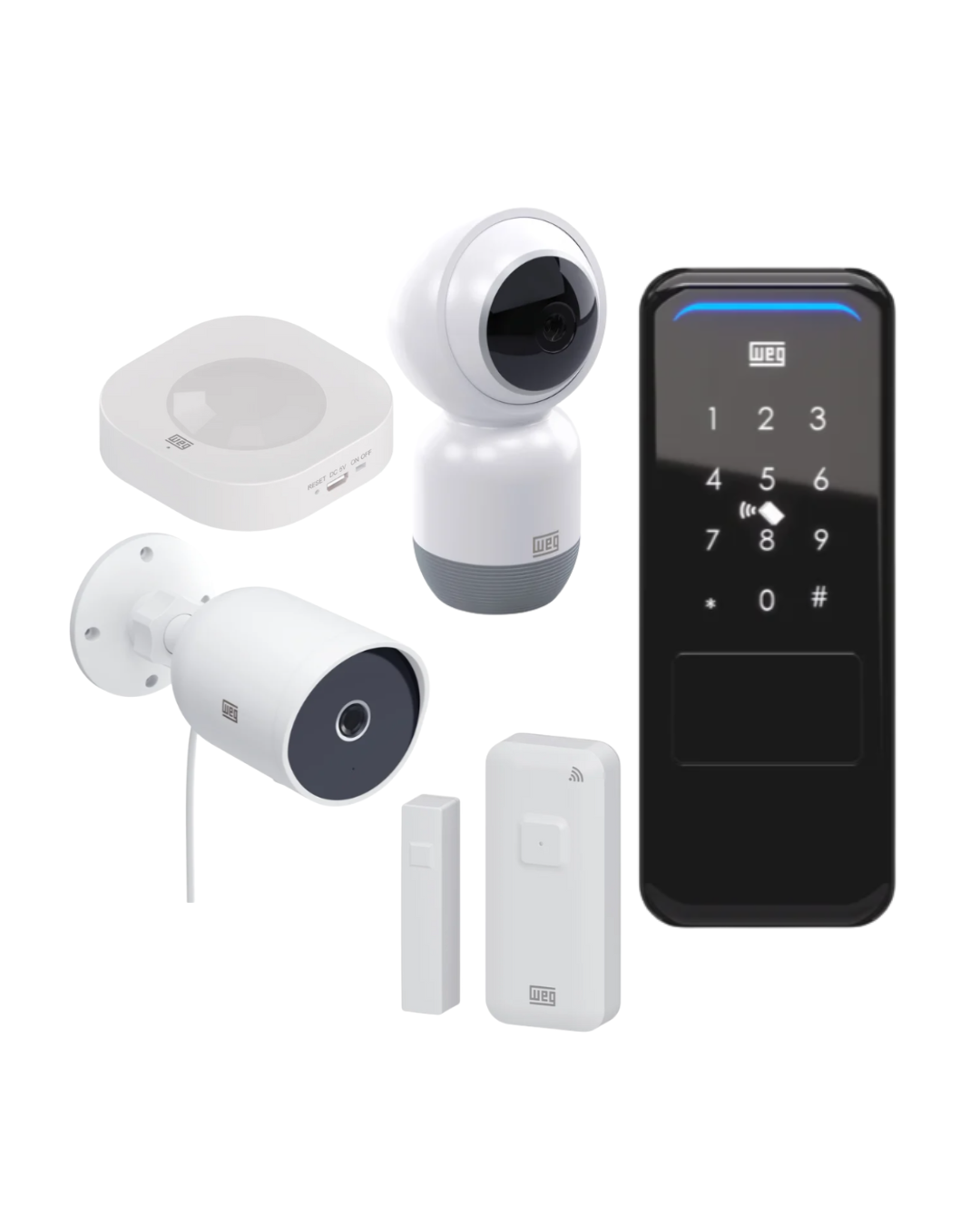 KIT SEGURANÇA: Este kit é essencial para a segurança da sua casa. Inclui 1 sensor de porta/janela, 1 sensor de movimento, 1 câmera interna panorâmica e 1 câmera externa, todos Smart e Weg Home.